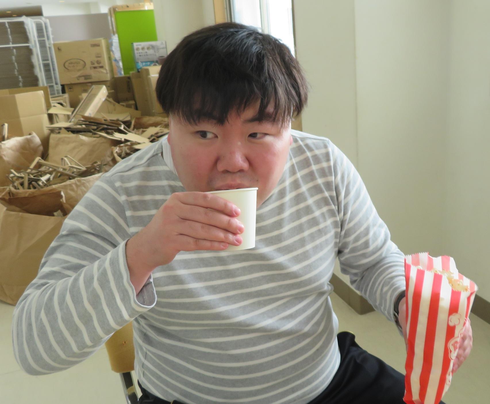 ポップコーンマシーンで出来立てのポップコーンと